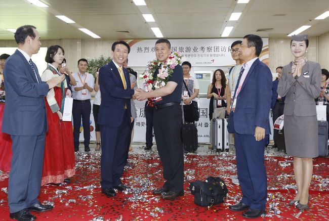 꽃목걸이 증정하고 있는 한국공항공사 사장 김석기(왼쪽), 베이징 리따오 국제여행사 총단장 천쉬이(오른쪽). 왼쪽 승무원으로부터 정세영(한국공항공사 서울지역본부장), 김석기(한국공항공사 사장), 천쉬이(베이징 리따오 국제여행사 총단장), 쉬청르(베이징 베이천 국제여행사 총경리), 마징뤼이(트레블링크 총경리), 조규영(아시아나항공 부사장)