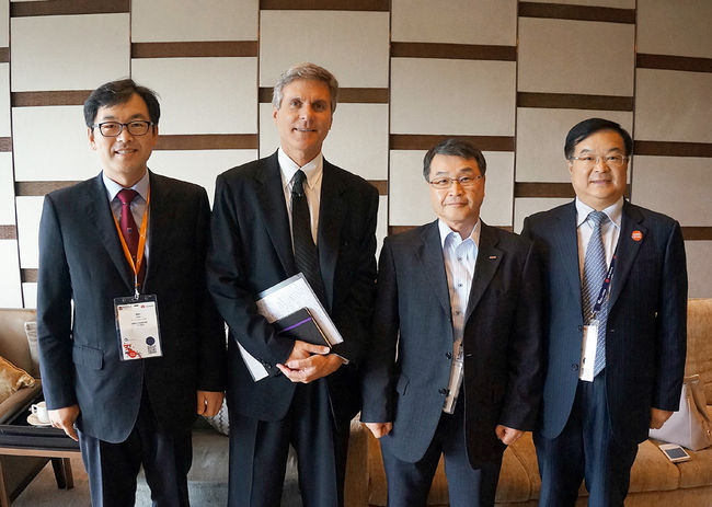 왼쪽부터 SK텔레콤 최진성 CTO, GTI 크레이그 에를리히(Craig Ehrlich) 의장, NTT 도코모 세이조 오노에(Seizo Onoe) CTO, 차이나모바일 리쩡마오(李正茂) CTO. / SK텔레콤
