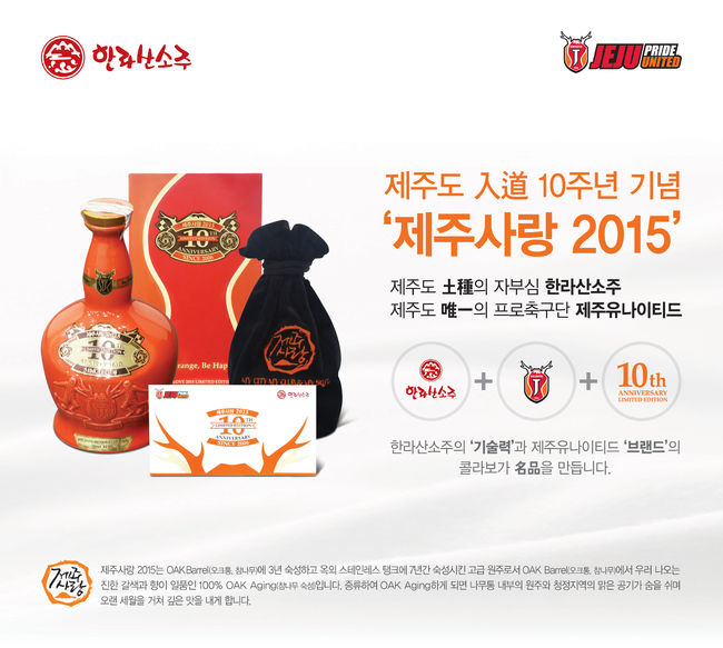 제주 유나이티드(SK 에너지 축구단)가 입도 10주년을 맞이해 한라산소주(대표이사 현재웅)와 특별한 콜라보레이션을 선보인다.