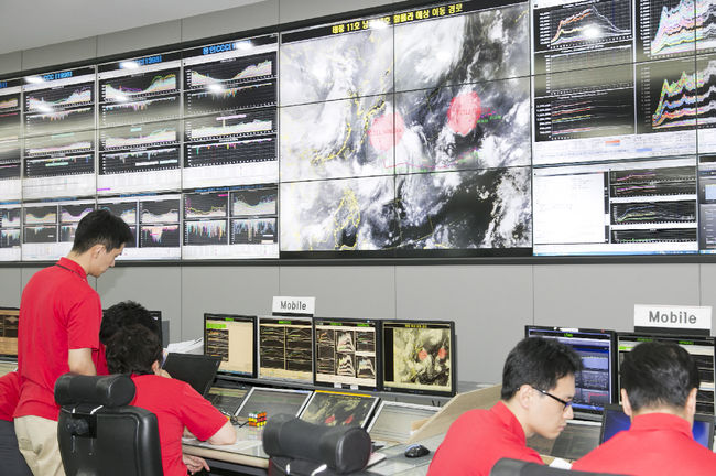 KT는 과천 네트워크관제센터의 종합상황실을 중심으로 비상운용체계를 가동하고 지역상황실을 함께 운영하며 실시간으로 기상정보를 파악하고 있다.