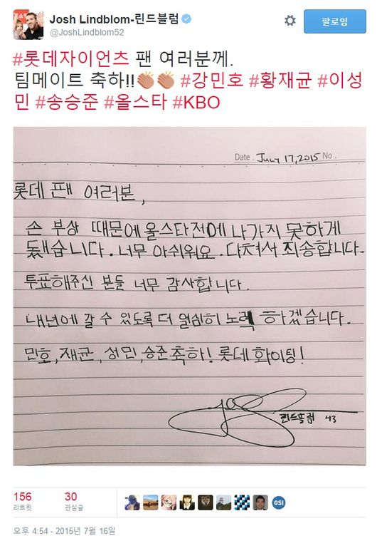 롯데 자이언츠 우완 조쉬 린드블럼(28)이 올스타전 출전 무산에 팬들에게 사과편지를 보냈다.