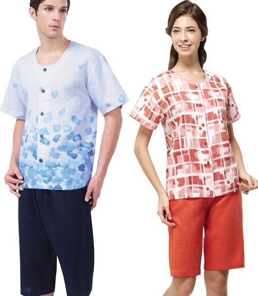 남성용 상의는 시원한 하늘색 컬러를 활용해 제품의 쾌적한 느낌을 살렸고 여성용 상의는 흰색 바탕에 독특한 빨간색 나염 패턴을 적용해 실내뿐만 아니라 간단한 외출 시에도 착용할 수 있다.