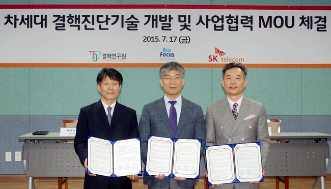 SK텔레콤과 진단기기 제조업체 바이오포커스, 대한결핵협회 산하 결핵연구원이 차세대 결핵진단기술의 개발을 위한 MoU를 17일 오후 체결했다. 체결식에서 바이오포커스 서정구 대표, 결핵연구원 김희진 원장, SK텔레콤 김명립 체외진단사업본부장이 적극적 협업을 통한 성과 창출을 다짐했다.(왼쪽부터) / SK텔레콤 제공