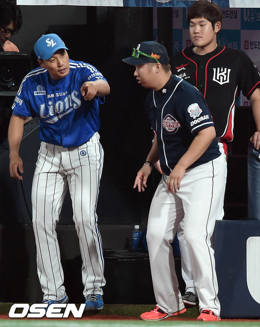 9회말 드림팀 이승엽과 유희관이 이야기를 나누고 있다.