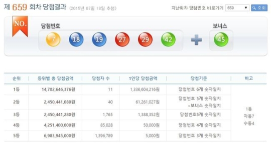 [OSEN=이슈팀] 제 658차 로또 당첨번호가 7, 18, 19, 27, 29, 42 번으로 추첨 됐다.