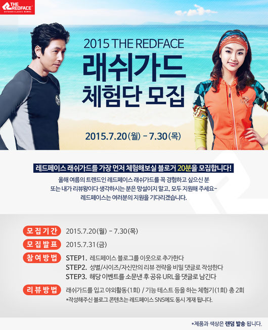 레드페이스는 '래쉬가드 라운드 티셔츠'과 '래쉬가드 재킷' 체험단을 20일부터 30일까지 모집하며 블로거라면 누구나 레드페이스 공식 블로그(http://blog.naver.com/rf58)를 통해 응모할 수 있다. 당첨자 발표는 오는 31일 레드페이스 공식 블로그에 공개하며, 체험단에 선정되면 아웃도어 활동과 기능 테스트 등의 활동을 자유롭게 진행한 후 체험수기를 2회 작성하게 된다.