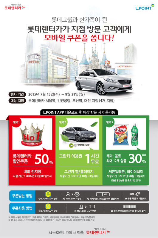 스마트 비콘서비스를 이용하기 위해서는 롯데멤버스 L.POINT APP을 설치 후 실행해 ‘위치기반 서비스 및 혜택 알림’을 켜두어야 한다. 롯데렌터카 해당 지점을 방문하면 쿠폰 확인 및 다운로드가 자동으로 이뤄지며 해당 쿠폰번호(바코드)를 직원에게 제시하면 혜택을 받을 수 있다.