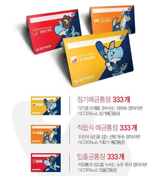정기예금통장, 적립식 예금통장, 입출금식통장 3종류로 구성된 웰컴저축은행의 NC 다이노스 통장은 마스코트 단디-쎄리를 활용한 캐릭터 통장이라는 점이 특징이다. 각 종류별 333개씩 모두 999개 한정이다.