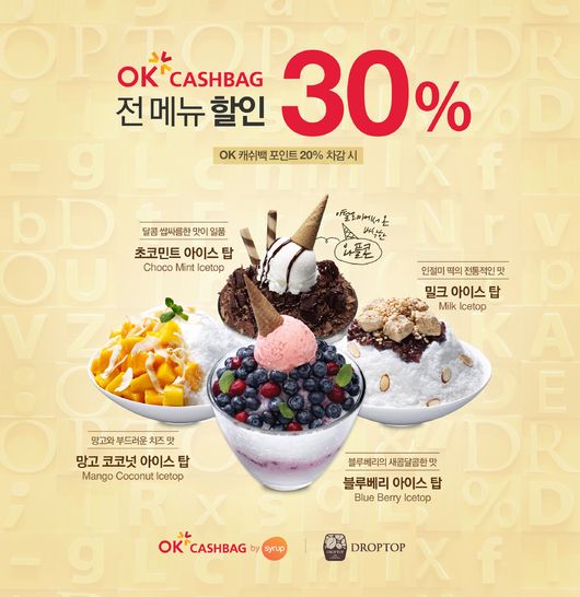 프랜차이즈 커피전문점 드롭탑(회장 임문수, www.cafedroptop.com)은 다음달 9일까지 OK캐쉬백 포인트로 음료 제품을 30% 할인해 주는 이벤트를 펼친다.(일부 매장 제외)