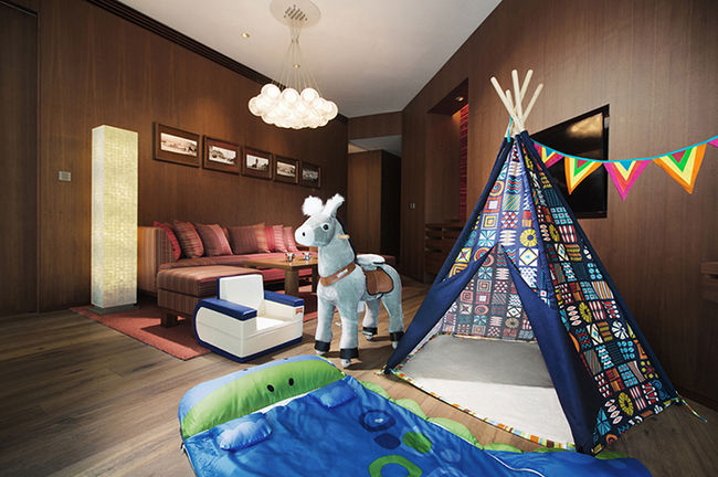 키즈룸에는 집이 아닌 낯선 환경에서도 아이가 쉽게 적응하고 즐거운 휴가를 보낼 수 있도록 도와주는 ▲유아동 텐트 브랜드 '쿠나텐트' ▲캐릭터 침구 브랜드 '밀로앤개비' ▲승마완구 브랜드 '포니사이클' ▲가구 브랜드 '북클레벤'의 대표 제품이 비치되어 있다.
