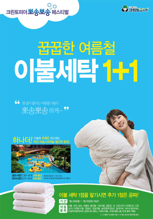 세탁 전문 프랜차이즈 크린토피아(www.cleantopia.com)가 이불 세탁 고객을 대상으로 1+1 혜택과 워터파크 할인권을 증정하는 '뽀송뽀송 페스티벌'을 진행한다.