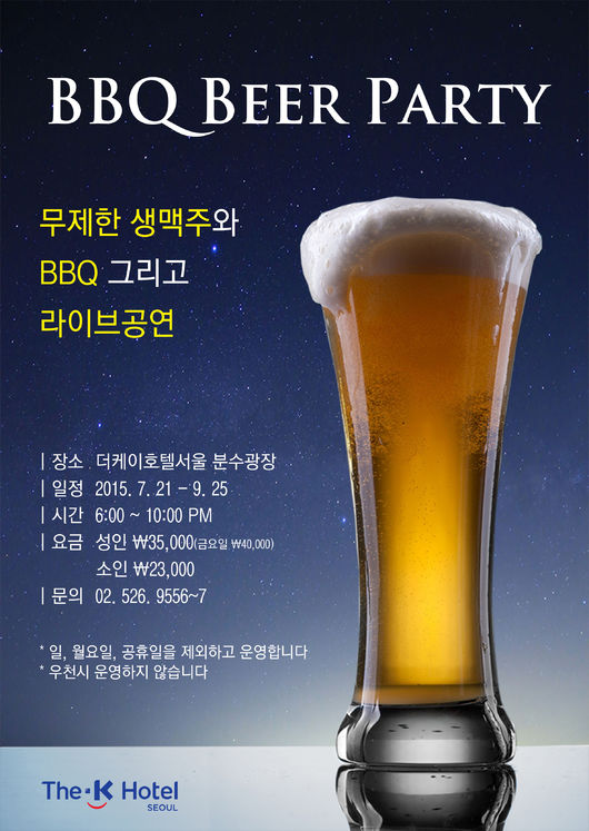 서초구 양재동에 위치한 더케이호텔서울(사장 강병직)에서 직장인들이 도심 속 자연을 즐기며, 쌓였던 스트레스를 풀 수 있도록 신나는 라이브 음악과 함께 다양한 바비큐와 세계 각국의 주류를 부담 없이 만날 수 있는 BBQ Beer 파티를 진행한다.