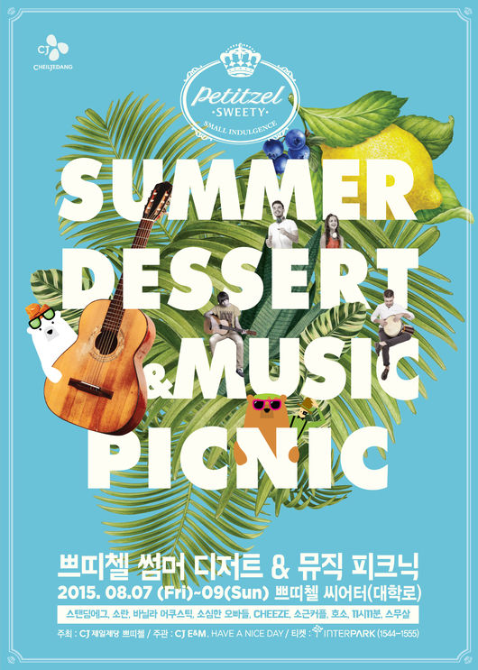 8월 7~9일 대학로 쁘띠첼 씨어터에서 '쁘띠첼 썸머 디저트 & 뮤직 피크닉' (이하 쁘띠첼 썸디피)이 펼쳐진다. 음원차트에서 선전 중인 어쿠스틱 팝 그룹 '스탠딩에그'를 비롯해 주목 받은 인디 밴드 '소란', 드라마 OST를 통해 인기를 끌고 있는 '바닐라 어쿠스틱', SNS에서 38만 팔로워를 보유하고 있는 '소근커플' 등 3일 간 총 9팀이 등장한다. 익숙한 멜로디와 음악성으로 인정받지만 좀처럼 라이브 무대를 만나보기 힘들었던 뮤지션들이 대거 출연하는 축제다. 이번 무대는 콘셉트에 맞게 공연장을 푸른 잔디밭과 피크닉 공간으로 꾸민다. 이달 20일부터 온라인 티켓 예매처 인터파크(http://ticket.interpark.com/Ticket/Goods/GoodsInfo.asp?GoodsCode=15008083) 에서 900매 한정으로 티켓오픈 하며, 예매자 전원에게는 쁘띠첼 디저트 박스도 제공한다.