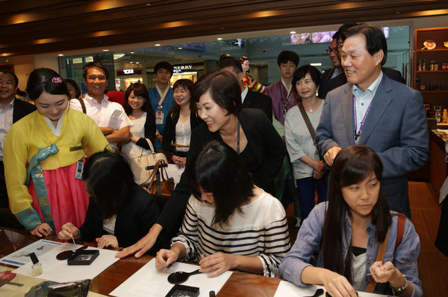 21일 오후 인천공항 한국전통문화센터에서 일본 여행사 대표단 및 언론 관계자들이 박완수 인천공항공사 사장(사진 중간 오른쪽)의 안내로 전통문화 체험 프로그램에 참여하고 있다. / 인천국제공항공사 제공