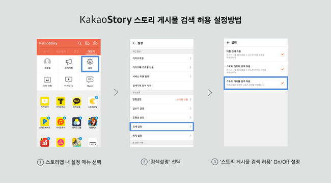 다음카카오는 이용자의 프라이버시 보호를 위해 다양한 검색 설정도 제공한다. 카카오스토리 더보기 - 설정 -0 검색설정 에서 기존 '이름 검색 허용' 및 '스토리 아이디 검색 허용'과 더불어 '스토리 게시물 검색 허용' 여부를 설정할 수 있다. 카카오스토리 검색, 나아가 카카오검색에 본인의 카카오스토리 게시물이 검색되지 않고자 하는 이용자는 검색 허용을 모두 해지하면 된다. 이 외에도 기존 '친구공개' 혹은 '나만보기'로 설정해놓은 스토리 콘텐츠는 검색되지 않는다.