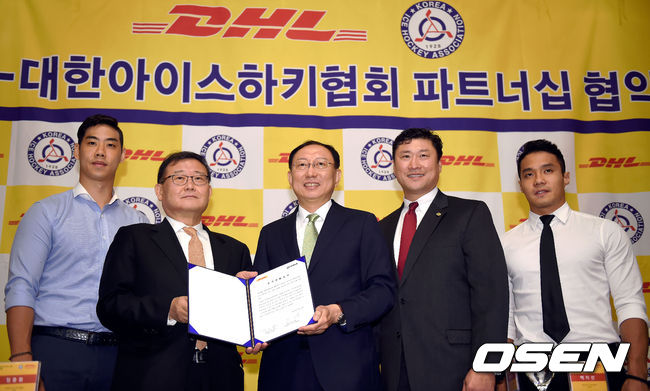 박우상, 정몽원 대한아이스하키협회장, 한병구 DHL 코리아 대표, 백지선 감독, 조민호(좌측부터) / 곽영래 기자 youngrae@osen.co.kr