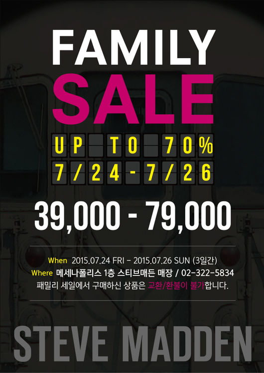 뉴욕 감성을 기반으로 매 시즌 힙한 슈즈 스타일을 제안하는 스티브매든은 이번 패밀리 세일을 통해 플랫샌들, 슬립온, 킬힐 등 다양한 제품을 선보이며, 일부 품목을 제외한 2015 S/S 상품을 최대 70% 할인한 합리적인 가격으로 만나볼 수 있다.