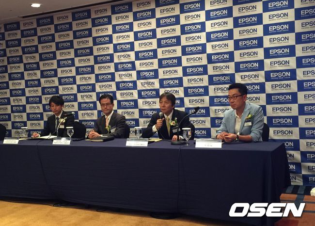 마이크를 들고 기자들의 질문에 답하고 있는 시부사와 야스오 한국엡손 대표이사, 맨 오른쪽이 허영 부장
