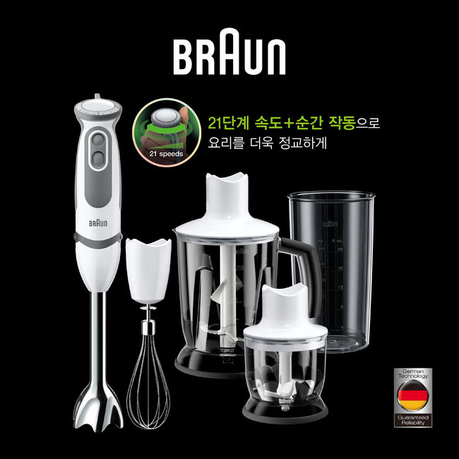 또한, 실용적인 거품기, 다지기(350ml), 블렌더(1250ml) 3가지 액세서리 구성으로 생크림 만들기, 양념류 다지기, 쥬스 블렌딩 등 용도에 따라 액세서리를 다르게 부착하여 사용할 수 있으며, 브라운 핸드블렌더만의 특징인 특허 받은 '파워벨' 기술로 독특한 벨 모양의 블렌딩 캡과 강력한 스테인리스 스틸 칼날이 서로 상호작용하며 음식물이 튀는 것을 방지하여 깔끔하게 재료를 준비할 수 있다.