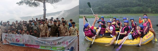 장애가정 청소년 멘티와 임직원 멘토가 함께 서바이벌 게임을 즐기고 기념 사진을 찍고 있는 모습, 장애가장 청소년 멘티와 임직원 멘토가 함께 래프팅을 즐기는 모습. / LG유플러스 제공