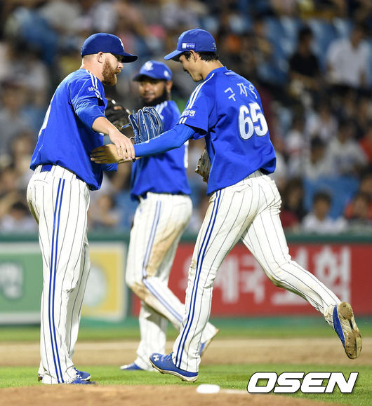 5회말 2사에서 삼성 클로이드가 정확한 송구로 한화 김태균을 처리한 구자욱과 하이파이브를 하고 있다.