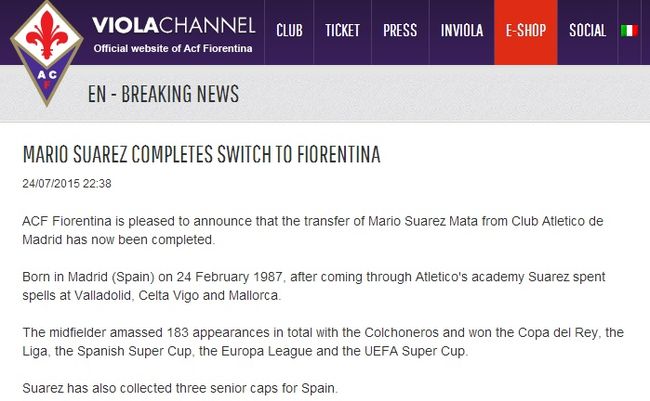 피오렌티나는 25일(한국시간) 구단 공식 홈페이지를 통해 수아레스가 피오렌티나로 이적을 완료했다고 발표했다.
