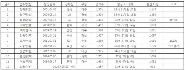KBO 리그 최초의 1000타점은 출범 18년 만인 2001년 한화 장종훈이 달성했다. 김태균이 1000타점 달성시 지난해 마지막으로 달성한 NC 이호준에 이어 12번째 기록이 된다.