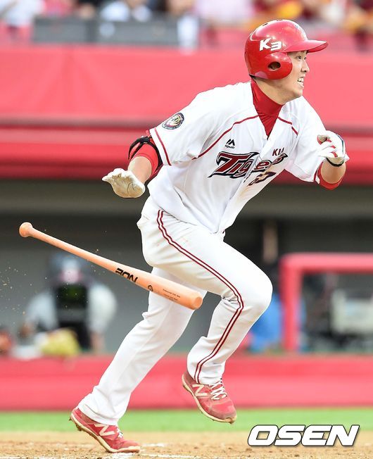 3회말 KIA 공격 선두타자로 나선 이인행이 우전안타를 날리고 있다.