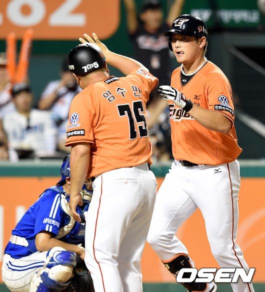 7회말 한화 공격 2사 주자없는 상황 이성열이 추격의 우월 솔로포를 날리고 홈을 밟으며 임수민 코치와 인사를 나누고 있다.