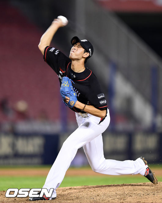 26일 오후 서울 잠실야구장에서 열린 2015 타이어뱅크 KBO 프로야구 LG 트윈스와 kt 위즈의 경기, 8회말 마운드에 오른 kt 김민수가 힘차게 공을 던지고 있다.
