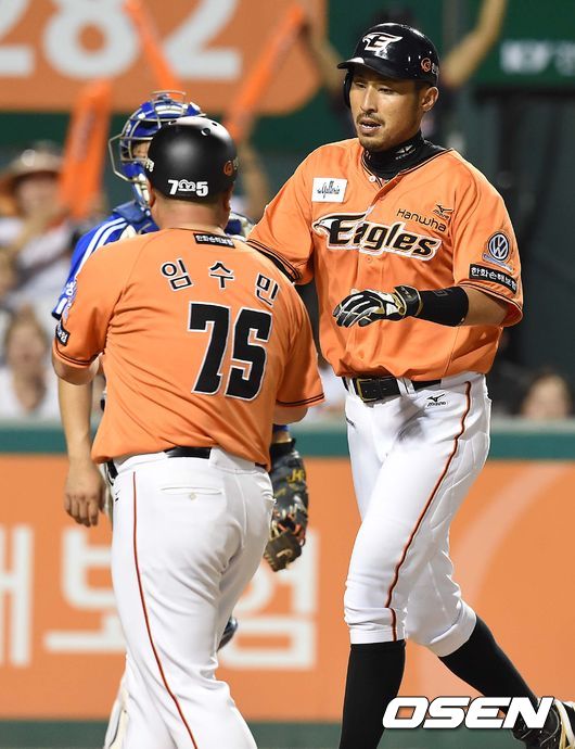 7회말 한화 공격 2사 주자없는 상황 김경언이 추격의 우월 솔로포를 날리고 홈을 밟으며 임수민 코치와 인사를 나누고 있다.
