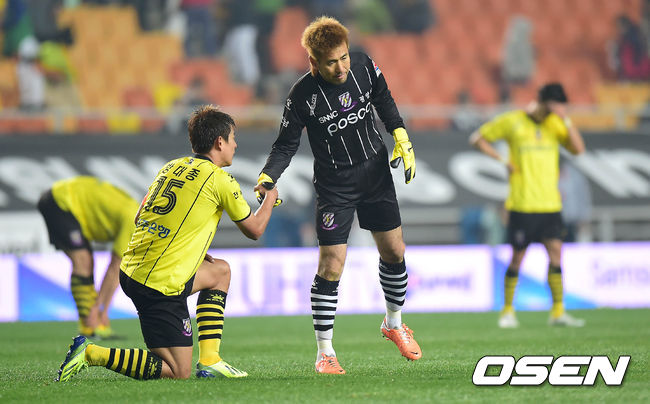 하지만 김병지의 무실점은 깨졌다. 전반 22분 프리킥 상황에서 키커로 나선 윤빛가람은 위력적인 오른발 슈팅으로 동점골을 뽑았다. 좌측 상단에 꽂힌 슈팅은 김병지가 어떻게 손을 써볼 도리가 없었다. 대기록을 세운 경기를 무실점으로 장식하고 싶은 것이 사람 마음이다. 하지만 실점 후에도 김병지는 의연했다. 오히려 그는 후배 선수들을 위로했다.