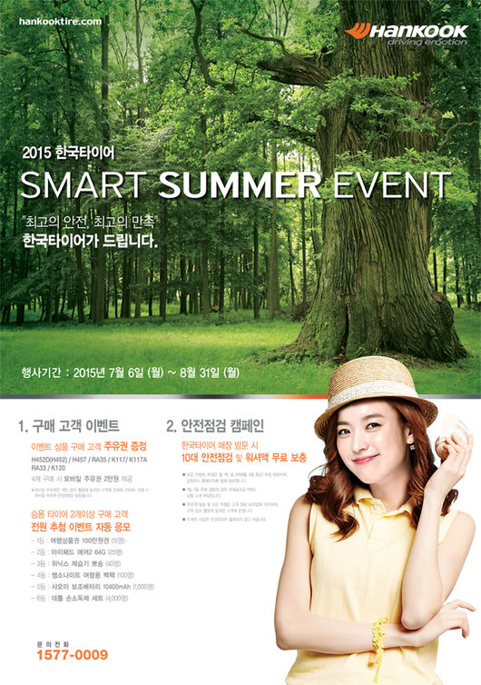 글로벌 선도 타이어 기업 한국타이어(대표이사 서승화)가 여름 휴가철을 맞아 타이어 구매자를 대상으로 여행상품권과 주유권 등 다양한 경품을 제공하는 ‘2015 한국타이어 스마트 썸머 이벤트’를 오는 8월 31일까지 실시한다.