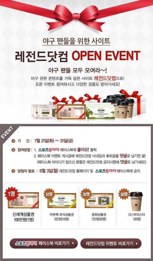 ‘레전드닷컴 OPEN EVENT’ 는 페이스북 ‘스포츠투아이’ 페이지에서 진행 중인 이벤트 화면에 레전드닷컴 닉네임과 축하글을 댓글로 남기면 응모가 가능하다. 페이스북 아이디가 없는 사용자들은 레전드닷컴 공지사항에 댓글로 참여 가능하다.