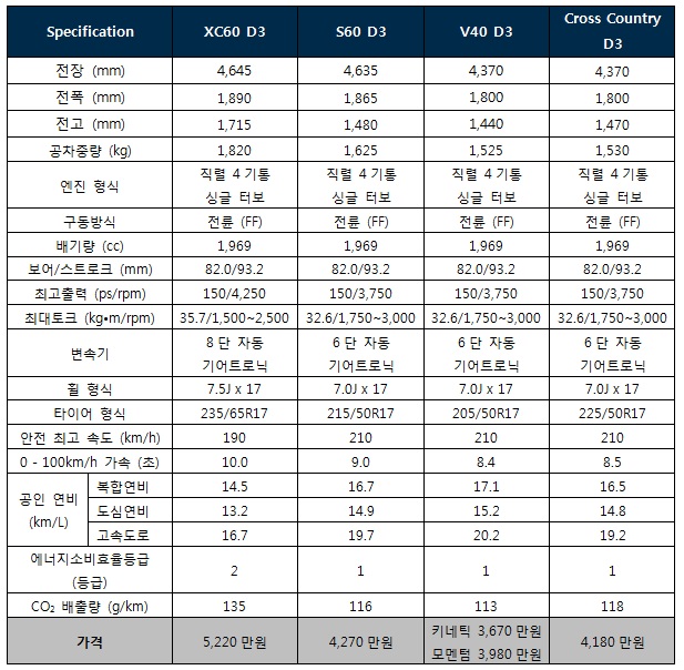 상반기 볼보자동차 최고 인기 모델인 S60에 D3엔진을 적용한 S60 D3는 기존 1,600cc의 D2 모델(최고 출력 115hp, 27.5 kg•m) 대비 토크를 26% 향상시키고 rpm 구간을 확장하여 가속성능이 크게 향상되었다. 연비 효율 또한 1등급(복합연비 16.7km/리터)을 자랑한다.