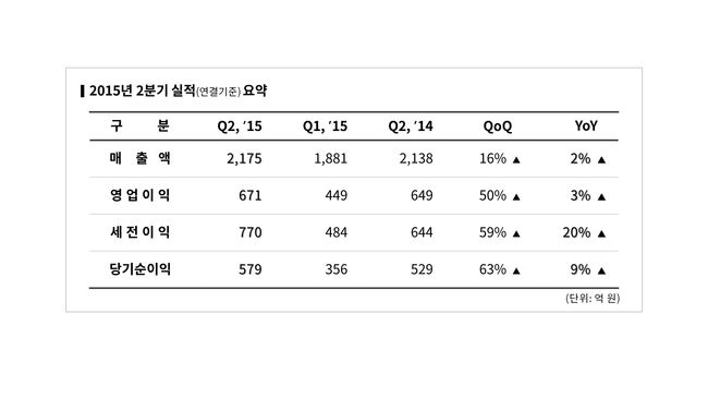 엔씨소프트가 2015년 2분기 실적 결산(연결 기준) 결과 매출 2175억 원, 영업이익 671억 원, 당기순이익 579억 원을 기록했다.