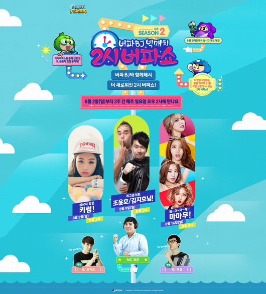‘2시 버파쇼 시즌2’는 8월 2일부터 16일까지 3주간 매주 일요일 오후 2시 아프리카TV를 통해 생방송으로 진행되며, 시즌1에서 활약한 개그맨 조윤호, 김지호를 비롯해 키썸, 마마무 등 연예인이 참여해 유저들과 대결을 펼치게 된다.