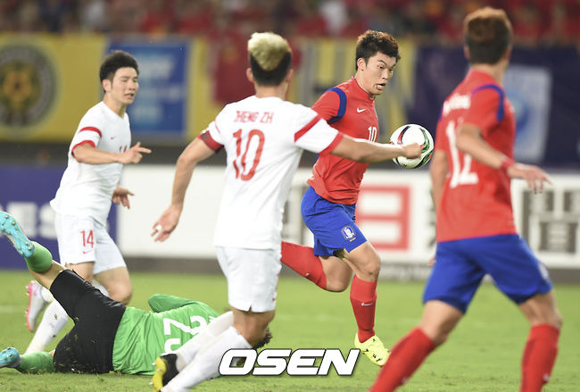 이정협을 최전방 공격수로 내세운 한국은 경기 초반 중국을 상대로 강한 압박을 시도했다. 권창훈과 장현수가 날카로운 움직임을 선보이며 공격 기회를 만들기 위해 노력했다. 중국은 정상적인 경기를 펼치지 못했다. 중원 힘겨루기에서 어려움이 생긴 중국은 측면에서 기회를 만들기 위해 노력했지만 쉽지 않았다.
