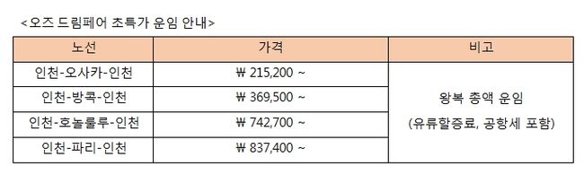 한편, 아시아나는 오즈 드림페어 개편을 기념하여 오즈 드림페어 항공권 구매고객을 대상으로 추첨을 통해 국제선 왕복항공권, 무료업그레이드 이용권, 여행가방, 커피머신, 외식상품권을 증정하고 오픈 당일 구매고객 중 100명에게 영화예매권 2매 등을 증정하는 이벤트를 진행한다. /letmeout@osen.co.kr