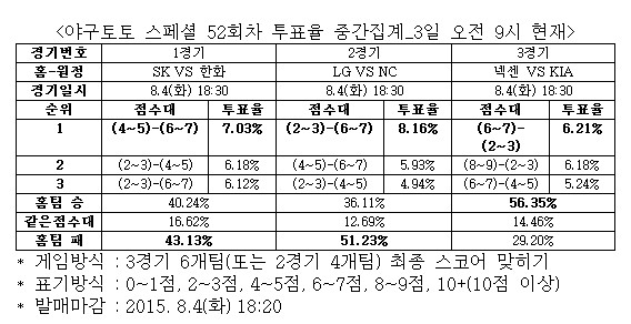 KBO 3경기 대상 야구토토 스페셜 52회차 투표율 중간집계