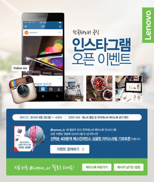 한국레노버는 이번 인스타그램 공식 오픈을 기념해 8월 3일부터 선착순 400명에게 베스킨라빈스 기프트콘을 증정하는 이벤트를 진행한다. 한국레노버 공식 인스타그램 계정을 팔로우하고 페이스북 페이지에 댓글로 인스타그램 아이디를 등록하면 자동으로 응모된다. /letmeout@osen.co.kr