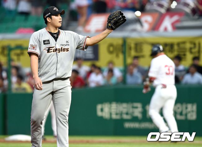 1회말 2사 2루 사오항 한화 선발 김민우가 정의윤을 볼넷으로 내보내고 있다.