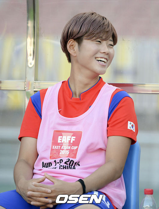 4일 오후 중국 후베이성 우한 스포츠센터 내 우한 스타디움서 열린 2015 EAFF(동아시아축구연맹) 동아시안컵 여자축구 한국과 일본의 경기에 앞서 전가을이 벤치서 미소 짓고 있다.