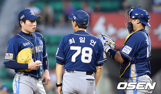 3회말 2사 1,2루 NC 최일언 코치가 마운드에 올라 이재학과 이야기를 나누고 있다.
