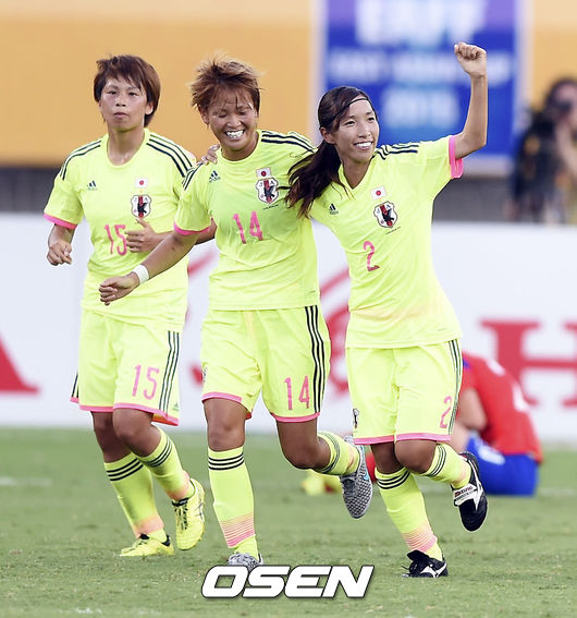 4일 오후 중국 후베이성 우한 스포츠센터 내 우한 스타디움서 열린 2015 EAFF(동아시아축구연맹) 동아시안컵 여자축구 한국과 일본의 경기, 전반 일본 나카지마 에미가 선취골 넣고 기뻐하고 있다.