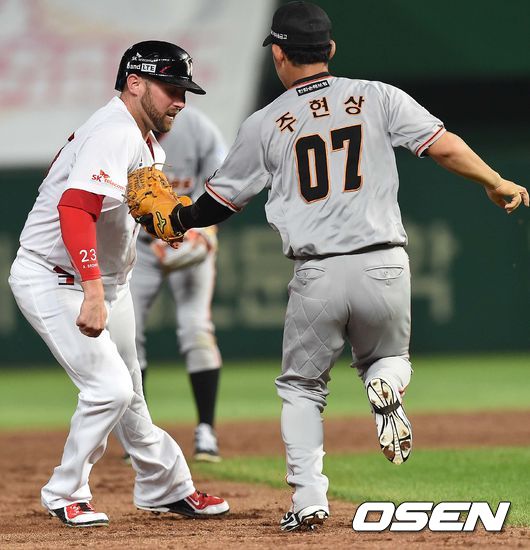 3회말 SK 공격 2사 1, 2루 상황 박계현의 우전안타 때 3루까지 내달린 1루 주자 브라운이 협살에 걸려 한화 3루수 주현상의 태그에 아웃되고 있다.