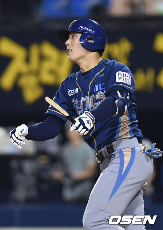 6회초 무사 1,2루 NC 김성욱이 적시타를 때리고 있다.