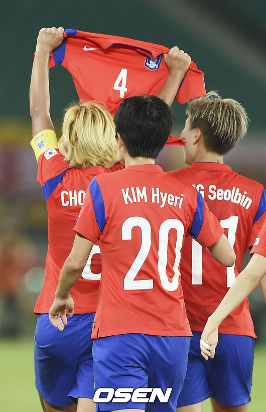 4일 오후 중국 후베이성 우한 스포츠센터 내 우한 스타디움서 열린 2015 EAFF(동아시아축구연맹) 동아시안컵 여자축구 한국과 일본의 경기, 후반 조소현이 동점골을 넣고 부상 귀국한 심서연의 유니폼을 들어 보이고 있다