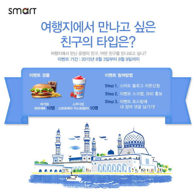 오는 9일까지 스마트 학생복 블로그(http://blog.naver.com/smartfnd)에 여행지에서 만나고 싶은 친구타입에 대해 댓글을 남기면 참여자 중 추첨을 통해 스무디킹 음료 10명, 버거킹 버거세트 10명을 뽑아 선물한다.