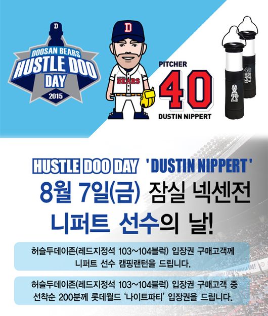 7일 실시하는 '허슬두데이'의 주인공은 더스틴 니퍼트다. 이날 두산베어스는 특정 관중석(레드석 103~104 블럭)을 '허슬두데이존'으로 편성, 이 좌석을 이용하는 팬들에게 니퍼트 선수 캐리커처 캠핑 랜턴을 증정하고, 니퍼트에게 직접 응원 메시지를 보내는 전광판 라이브 이벤트에 참여할 수 있는 기회도 함께 제공한다.